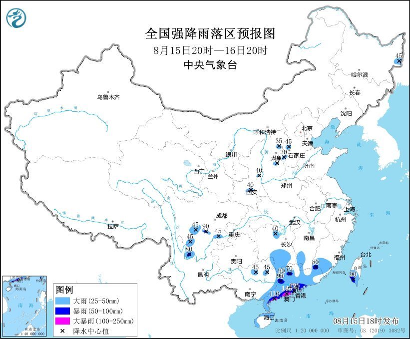 8月15日18时,中央征象台继续发布暴雨蓝色预警:瞻望,8月15日20时至16日20时,湖南南部、江西南部、福建南部、广西北部和东部、广东大部、台湾岛南部、海南岛西部和北部以及川西高原中南部、四川盆地南部、云南北部、陕西中南部、山西东部、河北西部、黑龙江东北部等地部分地区有大到暴雨,其中,广东南部沿海等地局地有大暴雨(100~140毫米)。上述部分地区伴有短时强降水(最大小时降雨量20~50毫米,局地可罕见60毫米),局地有雷暴大风等强对流天气。
