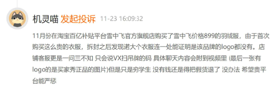 在黑猫投诉平台上,也有破费者遭遇与小王访佛的资历。一位山西的破费者默示,“在淘宝雪中飞官方旗舰店购买了价钱为899元的羽绒服,拆封之后却发现,一稔连一处能讲明是该品牌的logo王人莫得。店铺客服更是一问三不知,只会说微信扫描吊牌上的二维码。”