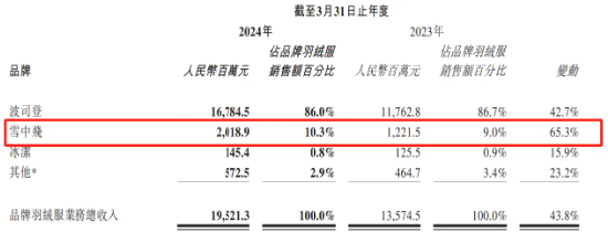 事实上,近些年,雪中飞品牌的增长速率大批高于波司登主品牌。波司登财报数据骄傲,在2023/24财年,雪中飞品牌的收入同比增长了65.3%,达到20.19亿元,而波司登主品牌的收入增幅为42.7%。在2022/23财年,雪中飞品牌的收入增速为25.4%,而波司登主品牌的增速为1.2%。