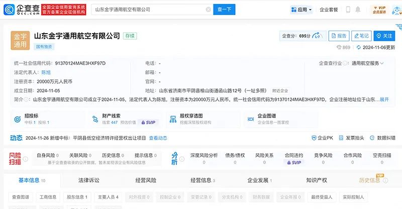 企查查信息深远,山东金宇通用航空成立于2024年11月5日,注册本钱2亿元东谈主民币,是平阴县旗下的一家国有独资公司,由平阴县财政局100%捏股。11月5日,平阴县低空经济特准谋划权出让形式公告认真发布,这亦然山东金宇通用航空首个中标形式。