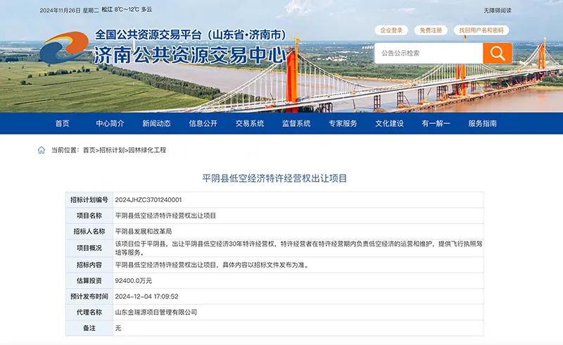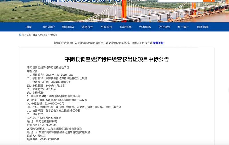 11月26日,济南各人资源往复中心官网深远,该形式已开标,山东金宇通用航空有限公司(以下简称“山东金宇通用航空”)以9.24亿元中标。这是天下首宗低空经济特准谋划权出让案例。