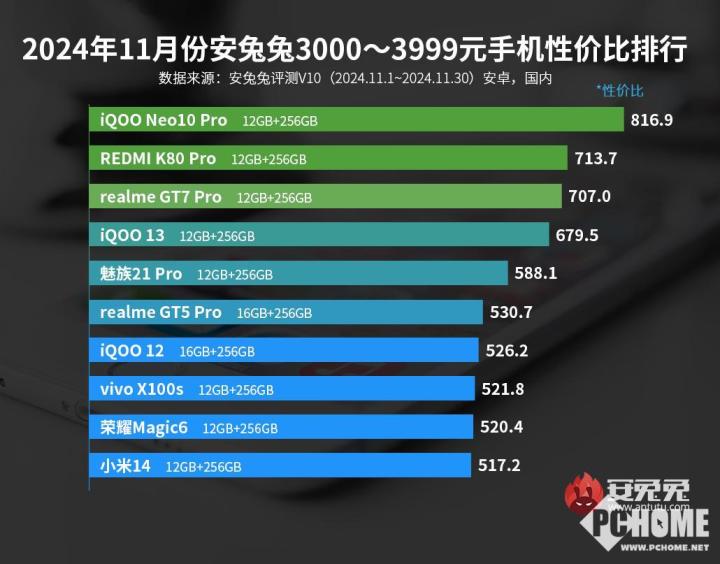 安兔兔评测官方公布了11月的各式名次榜,在性价比名次榜中,iQOO Neo10系列的两款手机,分袂登顶了2000-2999元和3000-3999元价位双榜,在性价比喻面呈现出了权贵的上风,尤其是iQOO Neo10 Pro的性价比,跳动于同价位机型一大截。