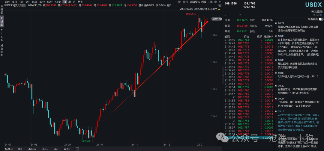 好意思国大选以来,好意思元连接走强,好意思元指数一度来到了109.5446 。这跟特朗普当选有很大的干系,背后有两个逻辑链条,一个是政府换届逻辑,民主党会突击费钱,增强政府支拨力度;一个是关税逻辑,商场预期特朗普会大力征收关税,伤害非好意思国度经济。