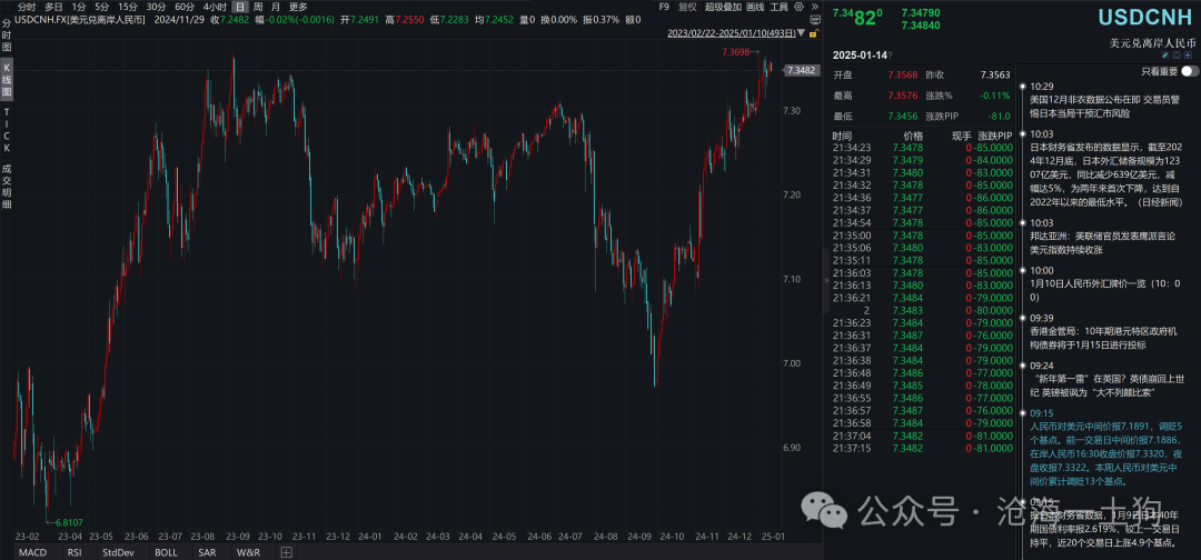 好意思元的走强给列国货币带来了宏大的压力,其中,也包括东说念主民币。如下图所示,东说念主民币照旧来到了7.35的蹙迫关隘。